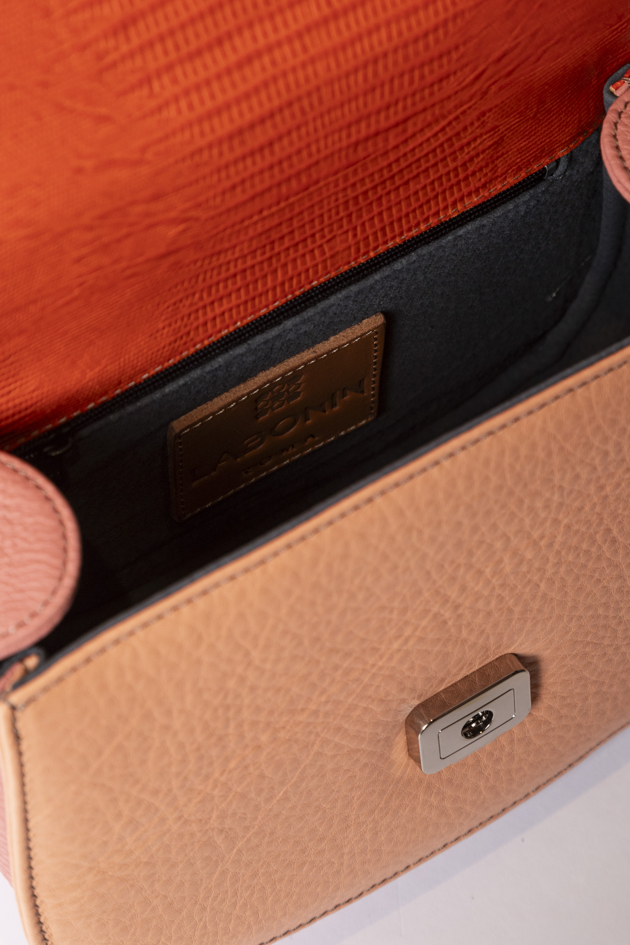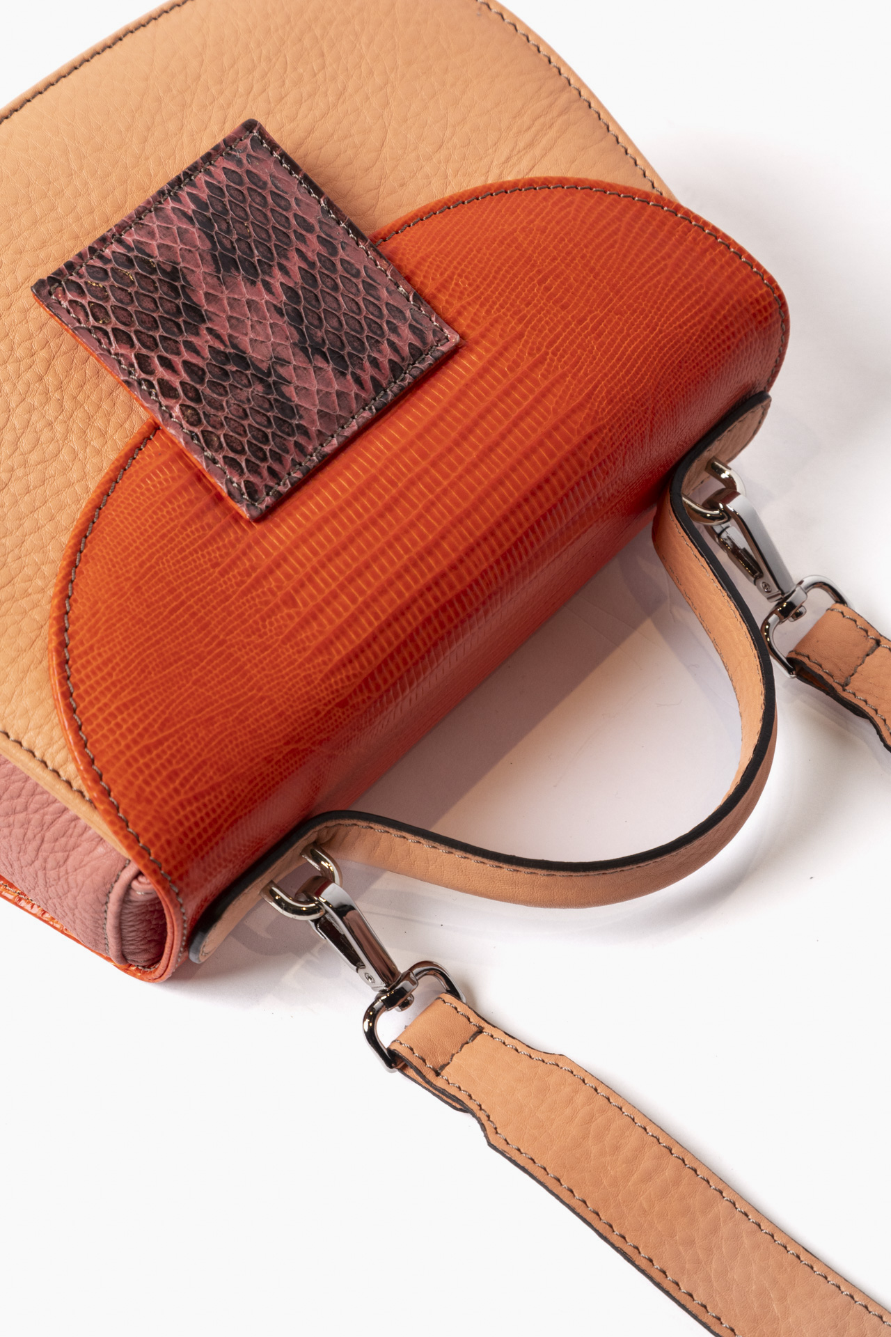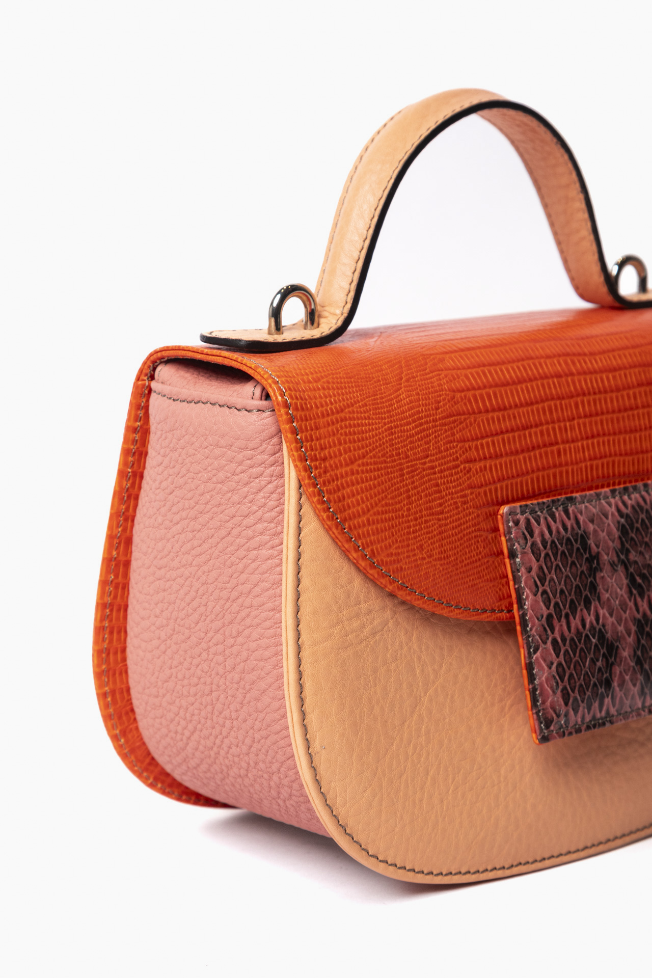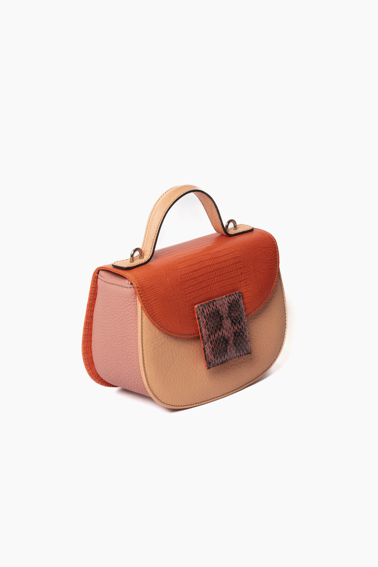 Ogni borsa presenta accostamenti originali di pellami e colori. Tracolla dinamica per il giorno , raffinato manico per la sera. Compatta fuori, spaziosa dentro.
