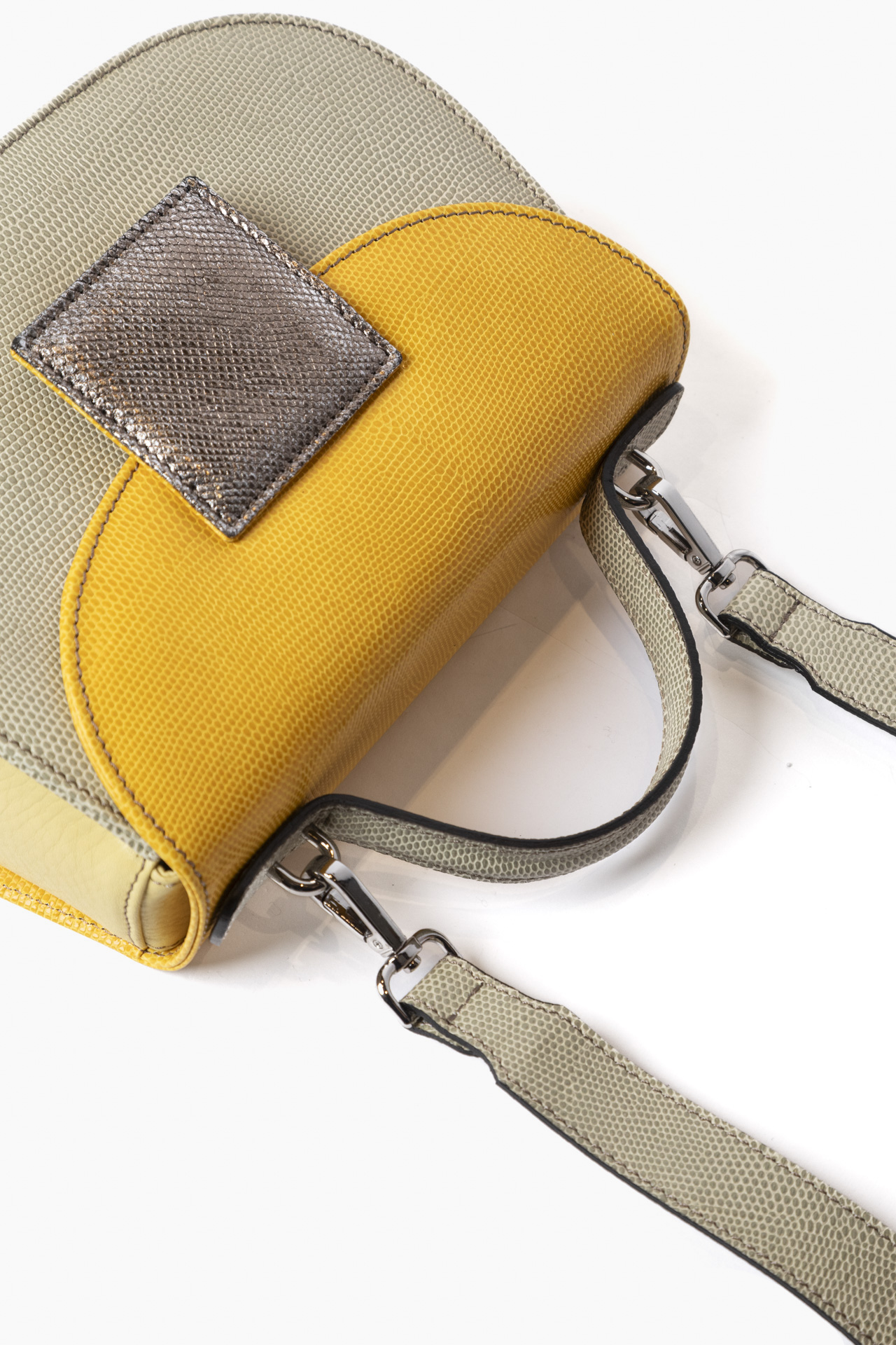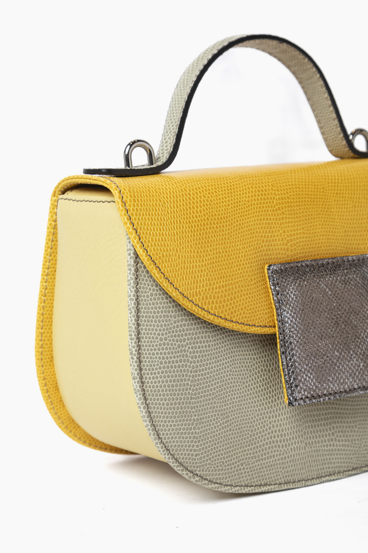 Ogni borsa presenta accostamenti originali di pellami e colori. Tracolla dinamica per il giorno , raffinato manico per la sera. Compatta fuori, spaziosa dentro.
