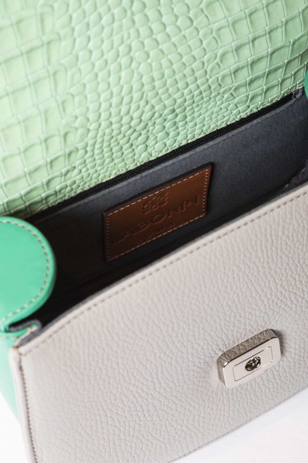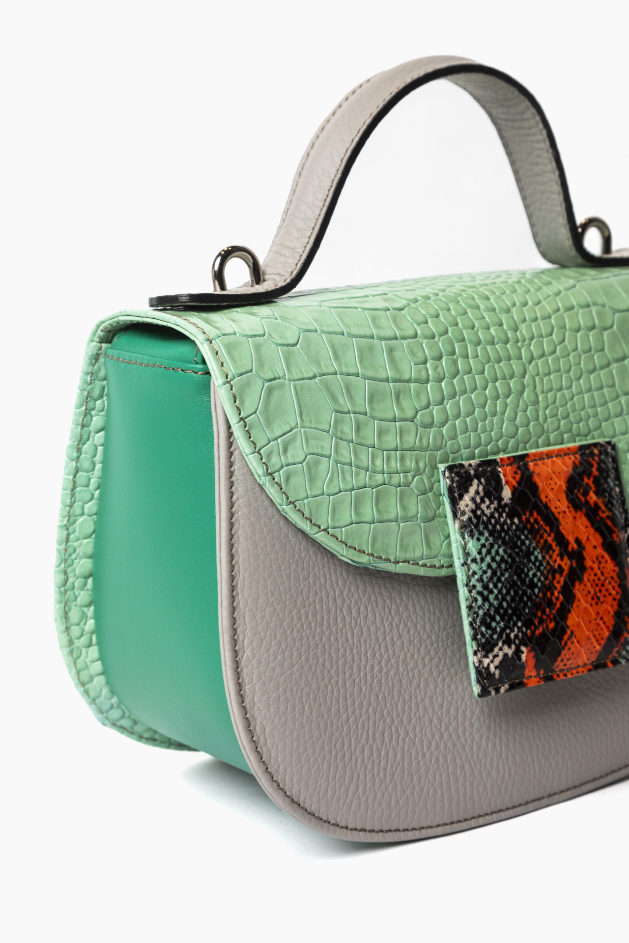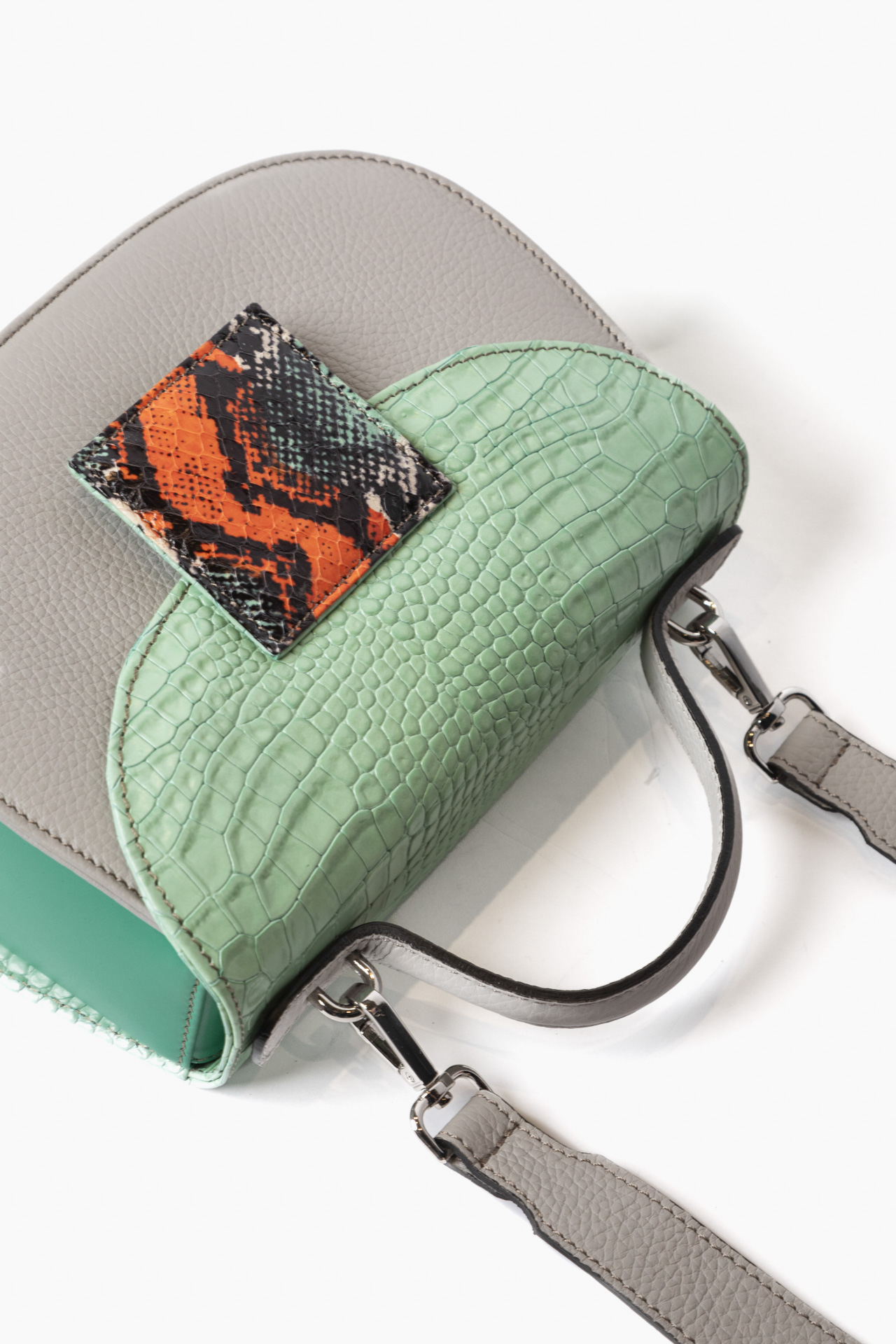 Ogni borsa presenta accostamenti originali di pellami e colori. Tracolla dinamica per il giorno , raffinato manico per la sera. Compatta fuori, spaziosa dentro.